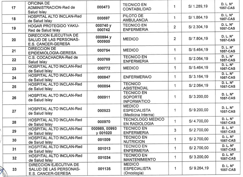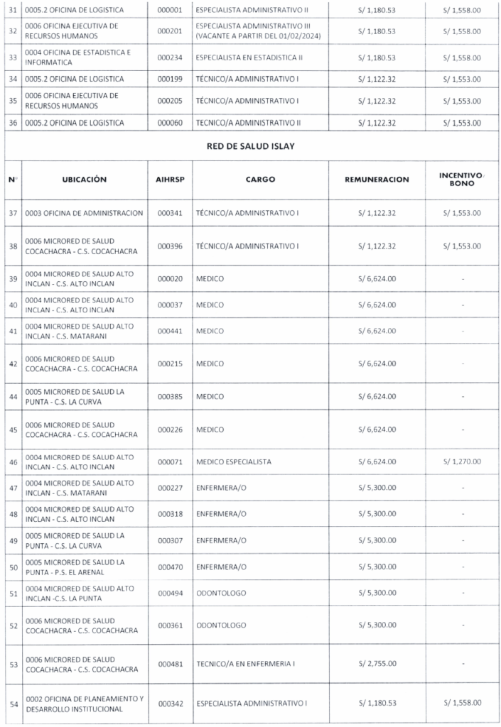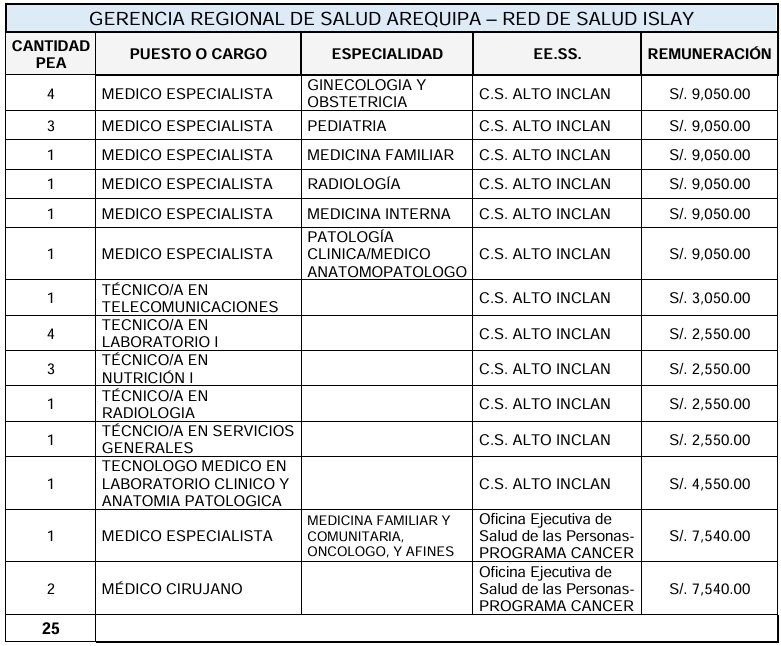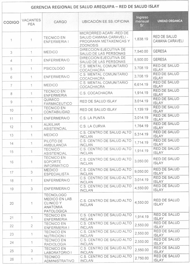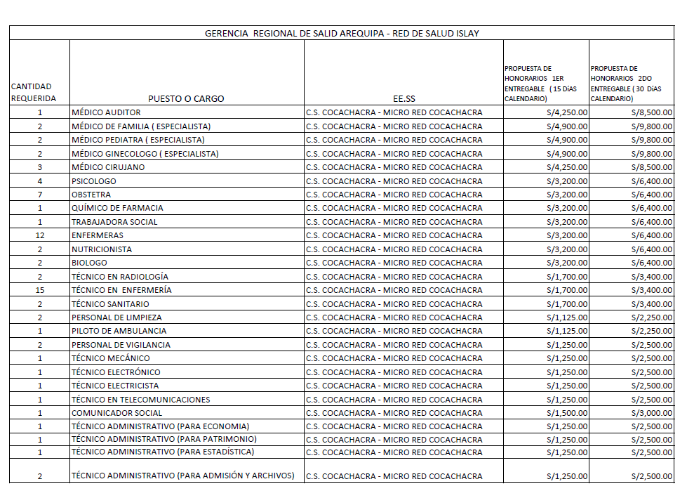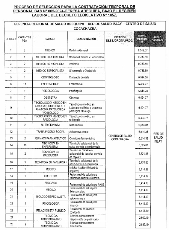 INVITACIÓN PÚBLICA 119-2025: PROCESO DE CONTRATACIÓN DE PERSONAL DE SALUD BAJO LA MODALIDAD SERVICIOS DE TERCEROS TÉCNICOS (AS) ADMINISTRATIVOS PARA BRINDAR EL C.S COCACHACRA – RED DE SALUD ISLAY – GERENCIA REGIONAL DE SALUD AREQUIPA