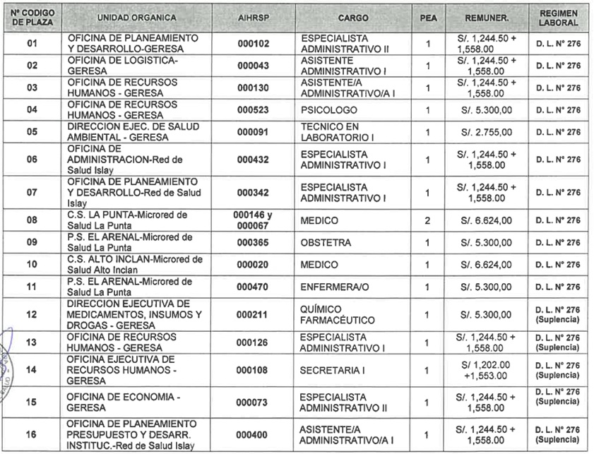 CANT PERFIL UBICACION ESTRUCTURAL 02 SEGURIDAD Y VIGILANCIA RED DE SALUD ISLAY 06 LIMPIEZA Y LAVADO DE ROPA DE INTERNAMIENTO RED DE SALUD ISLAY CRONOGRAMA [16/08/2023] RESULTADOS FINALES [22/08/2023]